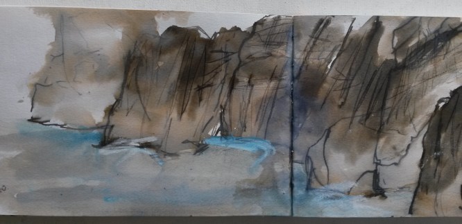 After walking the coastal path, often high up on the cliffs from Porthcurno to Cape Cornwall. I realised I needed to be much closer to the water to feel its full impact. Most of all at the level of the incoming tide and surf to smell the sea air, taste the salt on my lips, hear the crashing of the waves, filling all my senses. That whole sensation and physicality of being there and being exposed to the elements first hand. The wind and the salt spray in your face and on the sketchbook page are all part of the creative experience, trying to gain an emotional response to place.