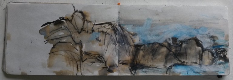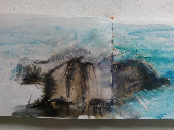 After walking the coastal path, often high up on the cliffs from Porthcurno to Cape Cornwall. I realised I needed to be much closer to the water to feel its full impact. Most of all at the level of the incoming tide and surf to smell the sea air, taste the salt on my lips, hear the crashing of the waves, filling all my senses. That whole sensation and physicality of being there and being exposed to the elements first hand. The wind and the salt spray in your face and on the sketchbook page are all part of the creative experience, trying to gain an emotional response to place.