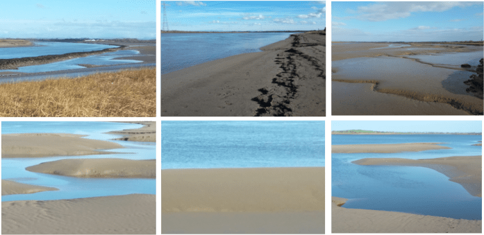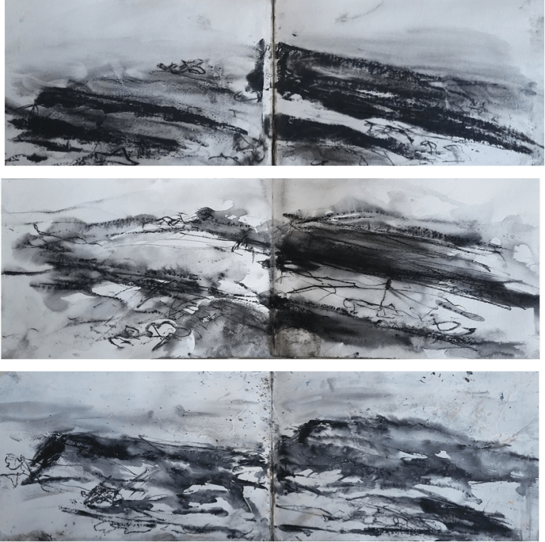 On my daily walks I’ve been taking photographs, which have now prompted some quick on-site sketches of the views, coastal rocks and sand banks. I’ve become even more conscious of time as I observe nature change before my eyes. The coastal landscape transforms every day and the sand banks move and alter in appearance. Things washed up become displaced and it’s interesting to observe how far they travel along the estuary. I tend to walk early, around the same time each day, when the sun is low and it’s still cool. The state of the tide is always different with new gullies forming and old ones disappearing or changing route. The sand banks are sometimes dry to walk on and sometimes covered with the tide. It’s mesmerising watching the tide race in and out, creating rapids and tiny whirl pools. The colours change from greys to blues depending on the weather. It’s never the same on any two days and that’s what I love.