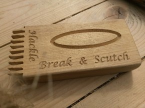 Hackling is the final stage of processing the flax where the shorter ‘tow’ fibres are separated from the longer ‘line’ fibres.The flax fibre is pulled through various sized heckling combs or hackles. Different sized heckling combs are used, progressing from coarser combs with only a few prongs (or nails) per inch, to finer combs. The finer the final heckling comb, the finer the flax yarn.