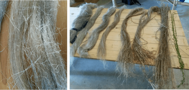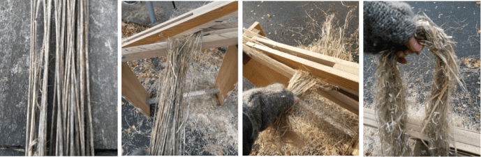 Scutching is the next stage in the processing to discard the broken inner woody shive. A scutching knife is used to scrape away and remove the broken bits, leaving the longer silky fibres. The shive left behind was often burned as fuel or used as animal bedding. These days it is used as a composite in the building trade and also used to make eco friendly bioplastic.
