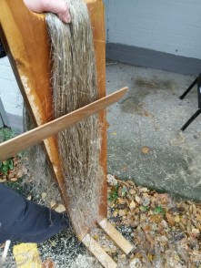 I found that some of my fibres broke during the scutching stage suggesting that I might have over-retted some of my flax after harvesting it. The act of retting removes the pectins that bind the fibres to the stalk and each other. If the flax is under-retted, it is harder to separate the fibre from the stalk whereas over-retting causes the fibres to deteriorate and break.