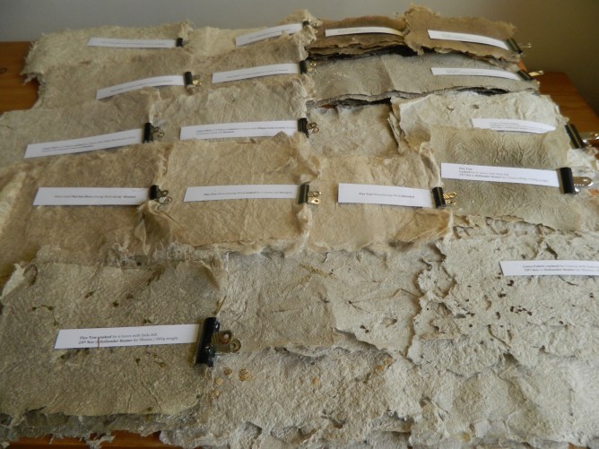 I learned that generally, the longer the fibre is beaten, the more water attaches to the cellulose, and the slower the pulp drains when a sheet of paper is created. The resulting paper is crisp and strong, with high shrinkage. Paper made from pulp beaten for a shorter time is softer and more flexible. This pulp drains freely when a sheet is made, and there is little shrinkage. But where to start? Did I need to cook the linen rags and tow fibres prior to putting it in the Hollander Beater? Did I need to soak the rags and tow fibres overnight? I decided to work methodically and try various approaches….uncooked, cooked, unsoaked, soaked. In my research I’d read that I should cook the rags or tow in soda ash…but how much soda ash and for how long? Some research suggested 3hrs…4hrs…5hrs.