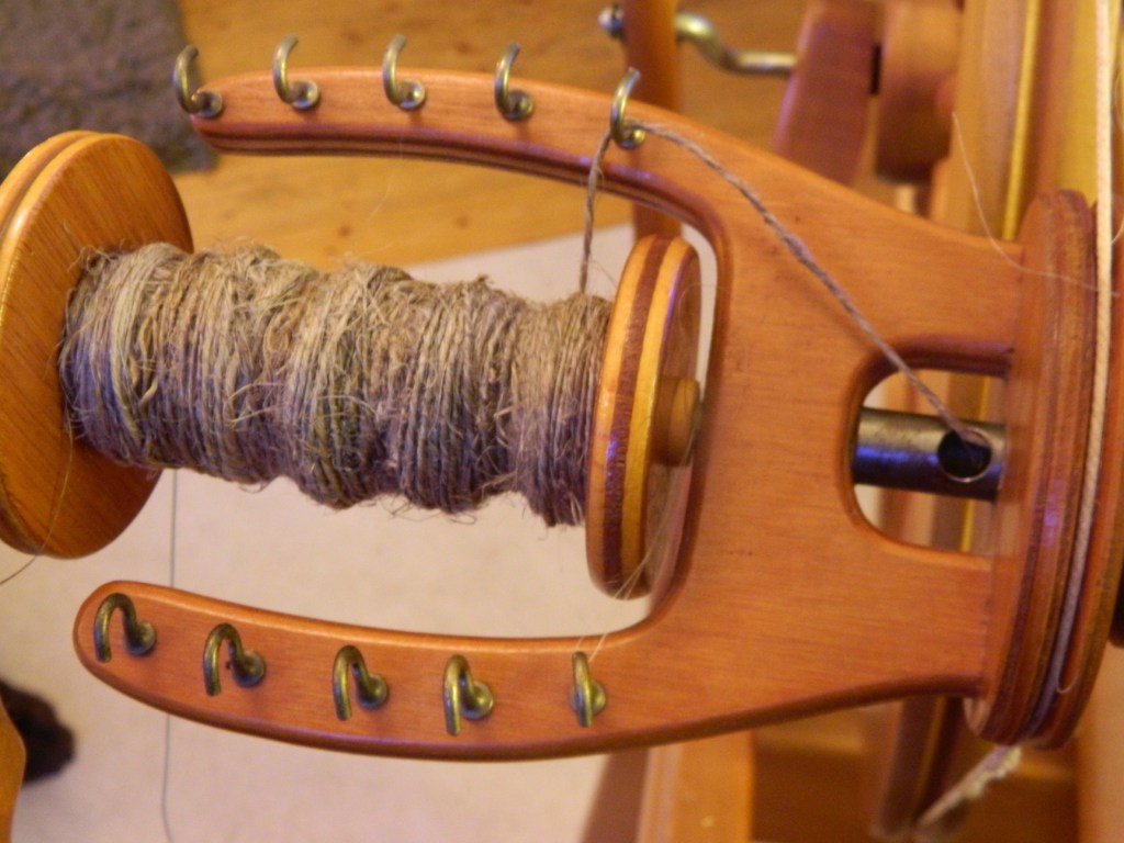 I am full of admiration of ‘proper’ spinners who can do the equivalent of tapping their head and rubbing their tummy at the same time. I started off with the drop spindle and I knew it got its name because the spindle is allowed to ‘drop’ down while the thread is formed. In other words, the weight of the drop spindle helps to pull down the fibres. What I hadn’t anticipated was that mine kept ‘dropping’ directly onto the floor more times than I dare reveal!